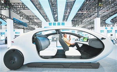 第三届中国(安徽)科技创新成果转化交易会上,观众在新能源汽车及智能网联汽车展区体验AI高性能极智超体座舱。
