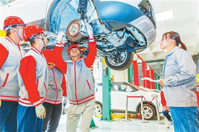 山东水利技师学院新能源汽车实训中心,学生正在进行新能源汽车整车维修和保养实操训练。